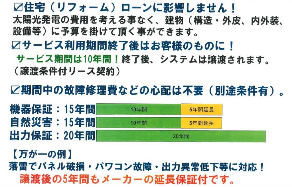 そこで、そのようなお客様からのご要望にお応えするために、太陽光発電システムの『定額利用サービス(10年間リース契約。その後システムの譲渡)』をスタートしました。